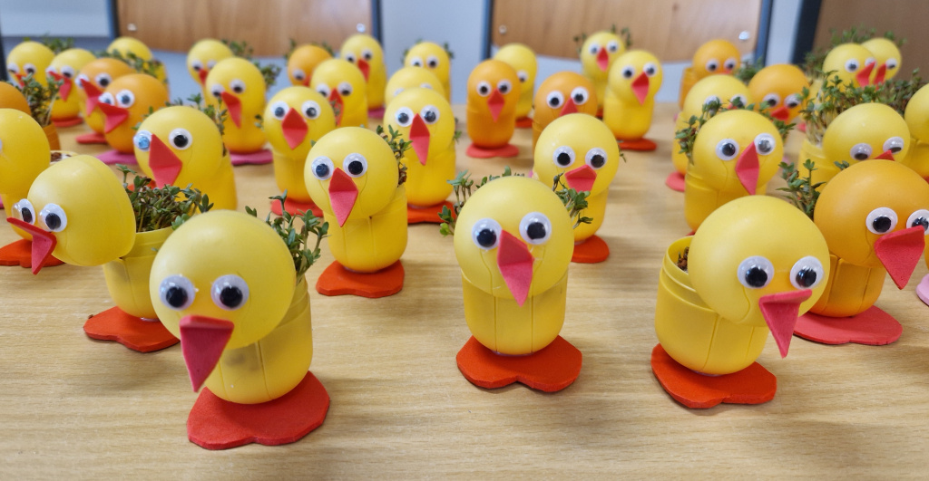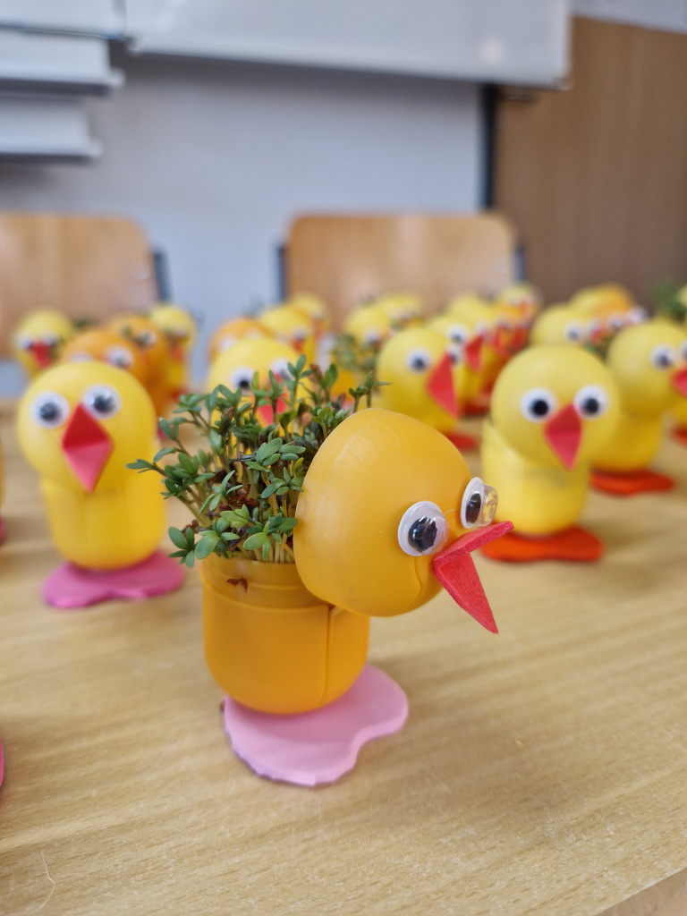 Auch haben die Kinder süße Kresse-Küken aus leeren Überraschungseiern gebastelt. Sie haben diese Kresse-Küken für jeweils 3,00€ verkauft, denn das ist in Lesotho der Preis für ein echtes Küken und ein wenig Saatgut.