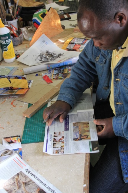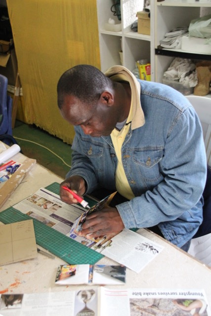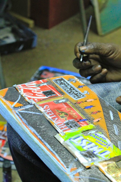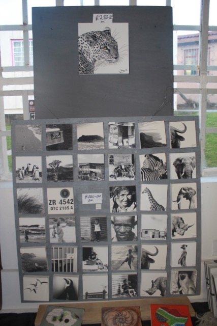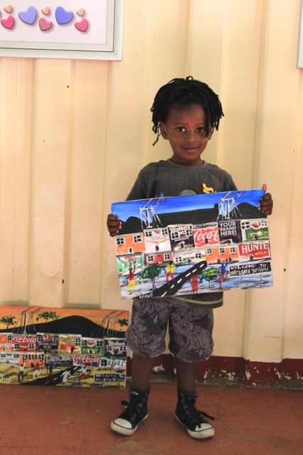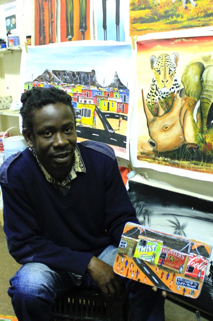 Ebenso wie Jevas und Star, verkauft auch Duncan seine Kunstwerke im civic centre. Duncan fertigt aus Getränkedosen Bilder, die das Leben im Township darstellen; so werden aus den Blechdosen die Wellblechhütten in denen die meisten Menschen in Imizamo Yethu leben. Auch sein Sohn Pidi mag die Kunstwerke seines Vaters und hilft beim Verkauf 😉 🙂 …