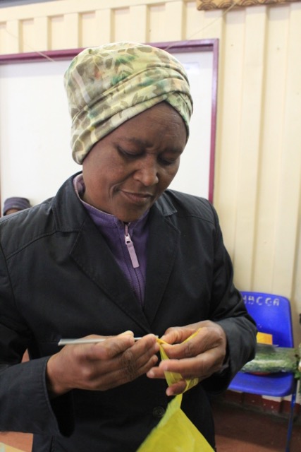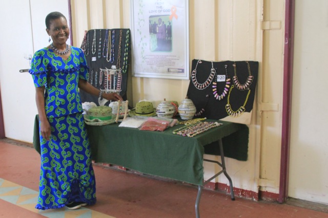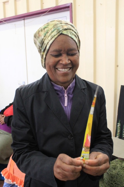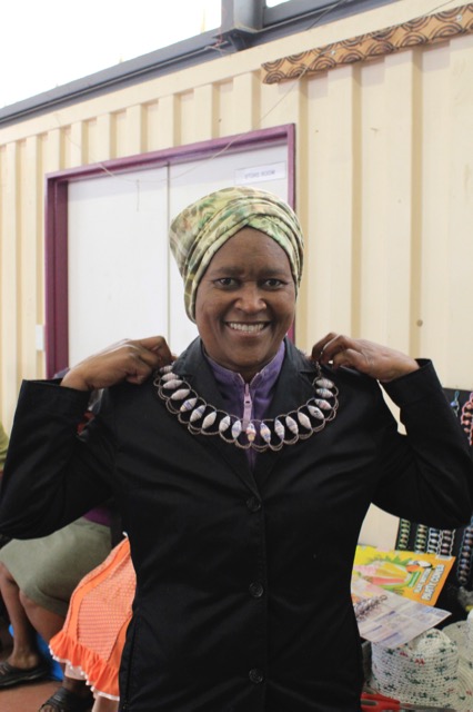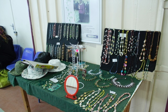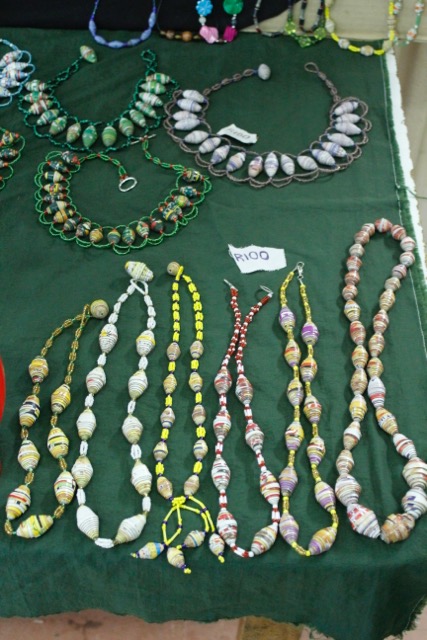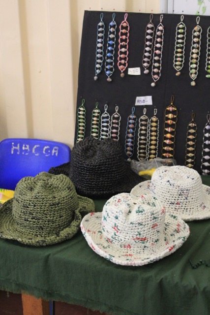 Im civic centre hat auch Star einen kleinen Verkaufsstand. An ihrem Stand verkauft sie Schmuck, den sie aus Recyclingmaterialien herstellt. Sie dreht aus Verpackungsresten (Pizzakartons, Müslieverpackungen, …) kleine Perlen. Diese Perlen nutzt sie, um daraus Ketten, Armbänder und Ohrringe herzustellen. Zudem häkelt sie aus Plastiktüten Sonnenhüte und Taschen. Auch ihre Ideen übernahm ich für meinen WP-Kurs.