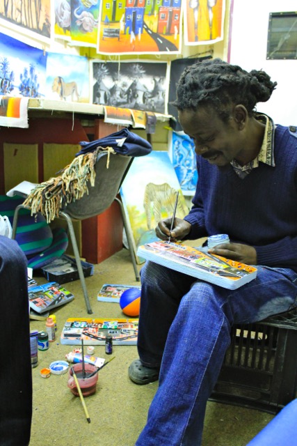 Wie mit allen Besuchern Imizamo Yethu´s ging Patrick mit mir auch in das “civic centre“. Es ist das Gemeindehaus, in dem Versammlungen abgehalten werden, Gottesdienste gefeiert werden und in dem sich auch Tanz – und Trommelgruppen treffen. Auch gibt es hier einige Räume, die von Künstlern gemietet werden können. So lernte ich Jevas, Star und Duncan kennen.