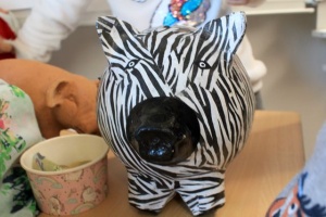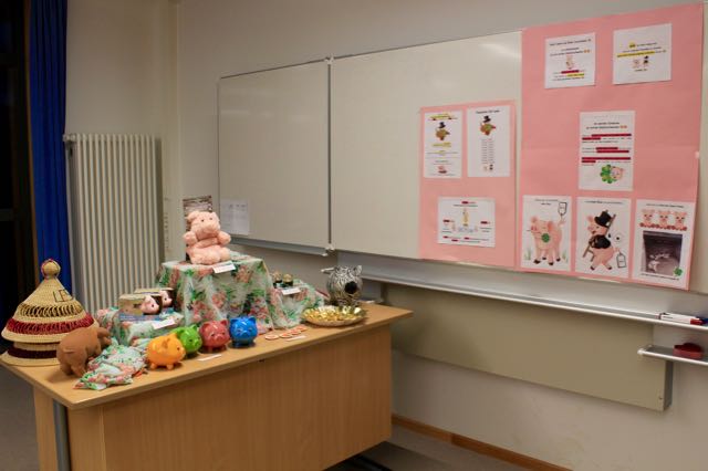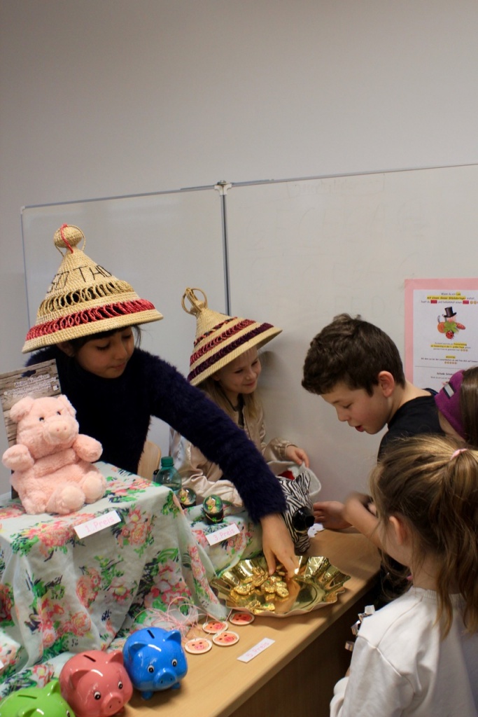 Da die Kinder neben den Losen auch wieder schöne weihnachtliche Bastelarbeiten verkauften, füllte sich ihr Spendenschweinchen immer mehr. Auch das durch den Verkauf der Bastelarbeiten eingenommene Geld, wollen die Kinder nutzen, um ihren Freunden Schweine zu schenken 🙂 .