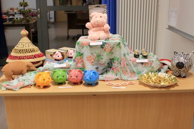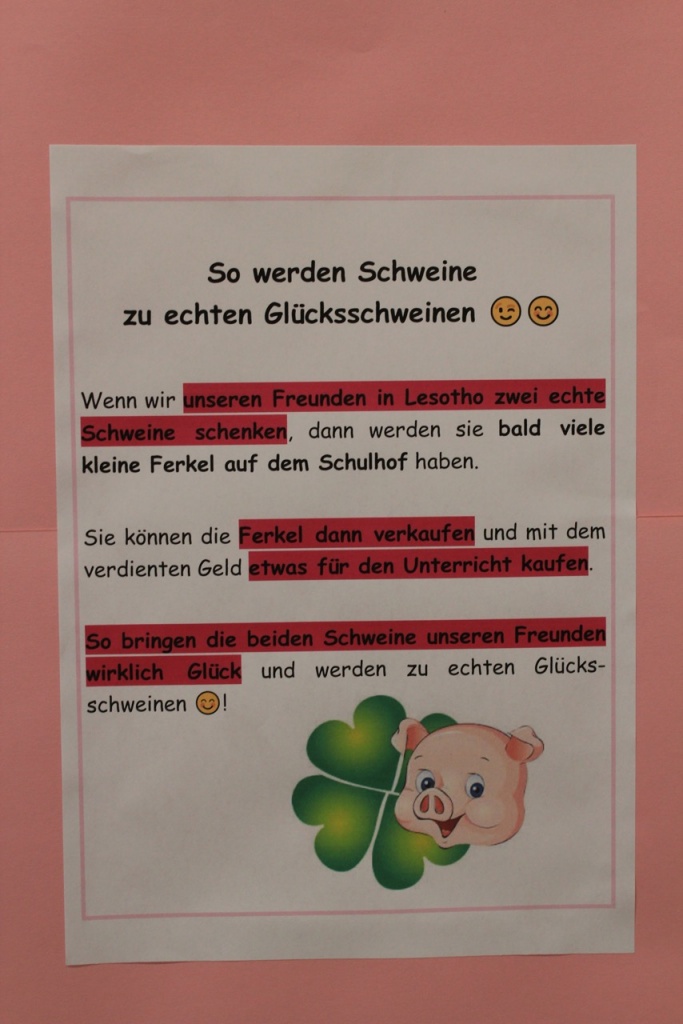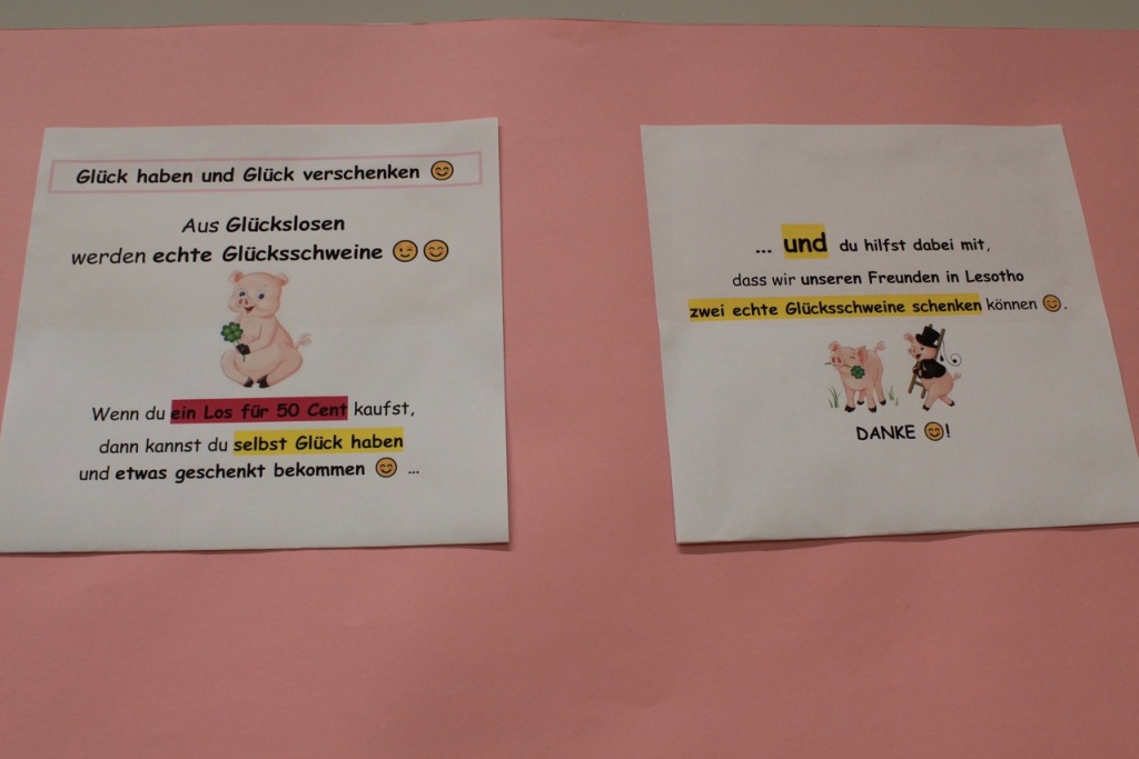 Dies war das Motto der Glücksschweinchen-Verlosung, die von den Kindern der Schule Falkenfeld veranstaltet wurde. Durch den Losverkauf wollten die Kinder Geld verdienen, um ihren Freunden in Mokhotlong zwei Schweine für das neue Jahr 2020 schenken zu können. Ihr Ziel war, 200 Lose zu verkaufen, um 100 € zu verdienen.