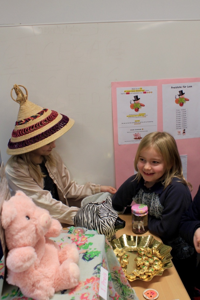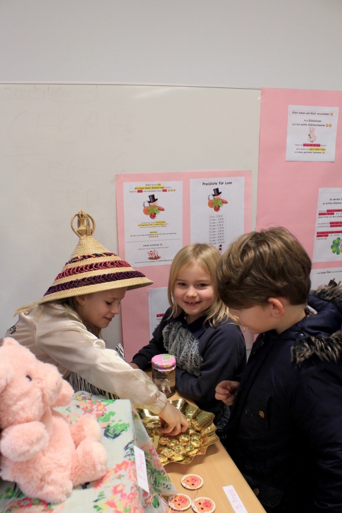 Der Andrang war groß, denn viele wollten ihr Glück herausfordern und einen der tollen Preise gewinnen 🙂 🙂 🙂 . Jedesmal war es für die Kinder spannend, eines der Lose zu öffnen und nachzuschauen, ob ein Gewinnerlos gezogen wurde. Immer wieder hörte man Jubel, weil ein Kind Glück hatte und eines der begehrten Gewinnerlose gezogen hatte 🙂 🙂 🙂 … und immer wieder hörte man “Schade Schokolade” und zwar immer dann, wenn ein Kind ein Los mit einem Trostpreis gezogen hatte und sich ein Schoko-Glücksschweinchen nehmen durfte 😉 …